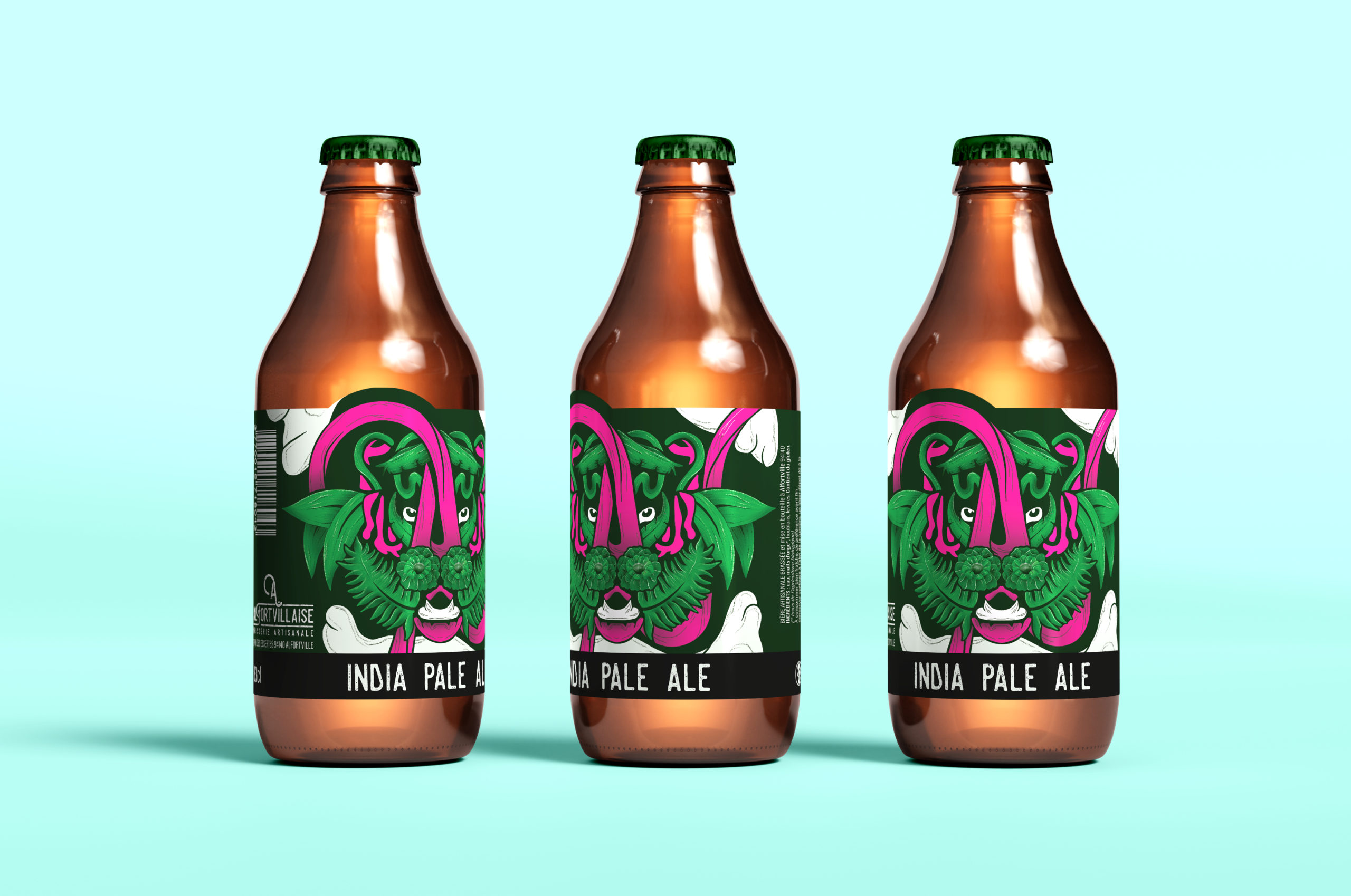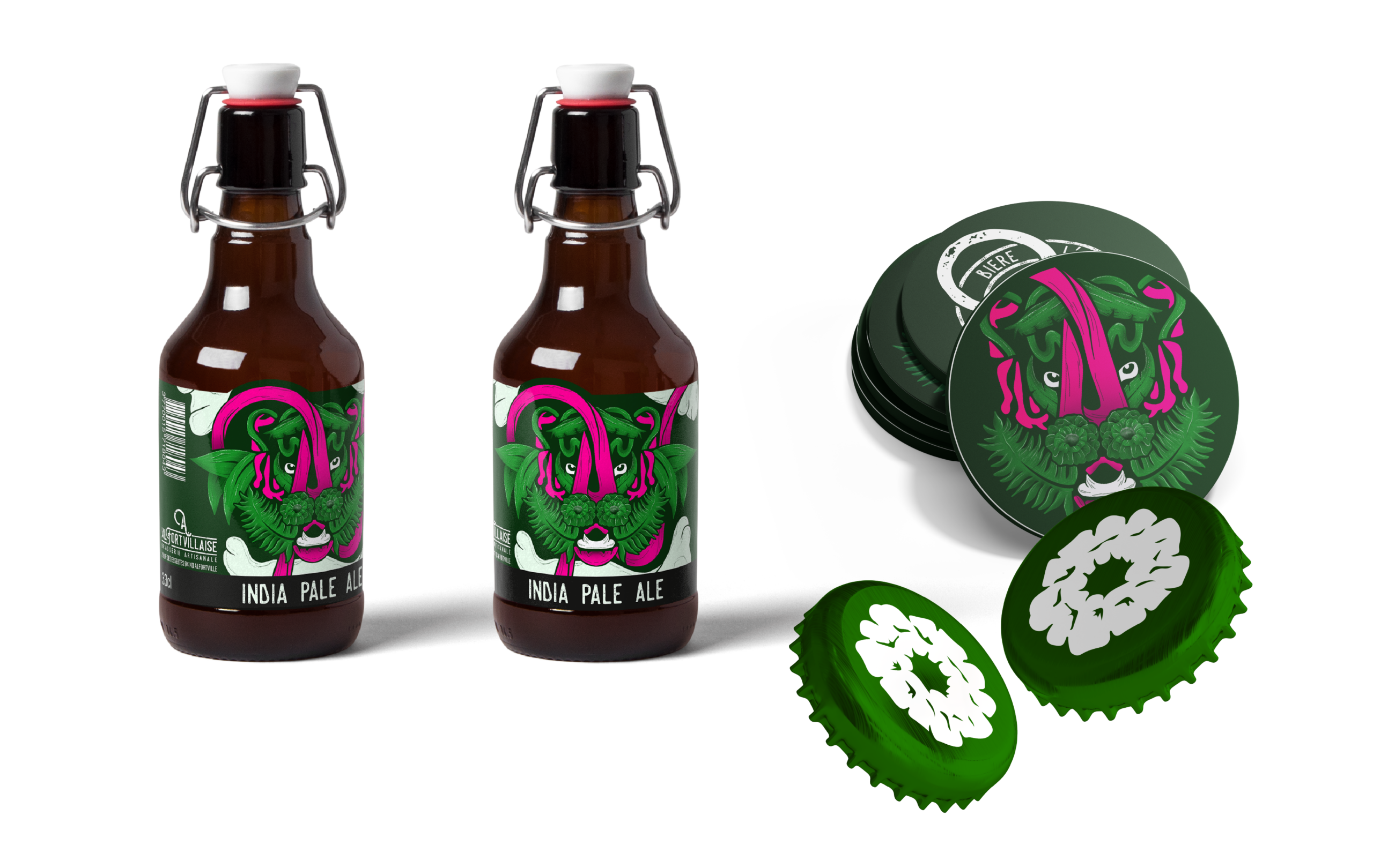 Dans le cadre d’un concours organisé par L’Alforvillaise, brasserie artisanale locale, j’ai conçu une identité visuelle complète pour leur gamme d’India Pale Ale, comprenant une étiquette, un sous-bock et une capsule de bouteille.